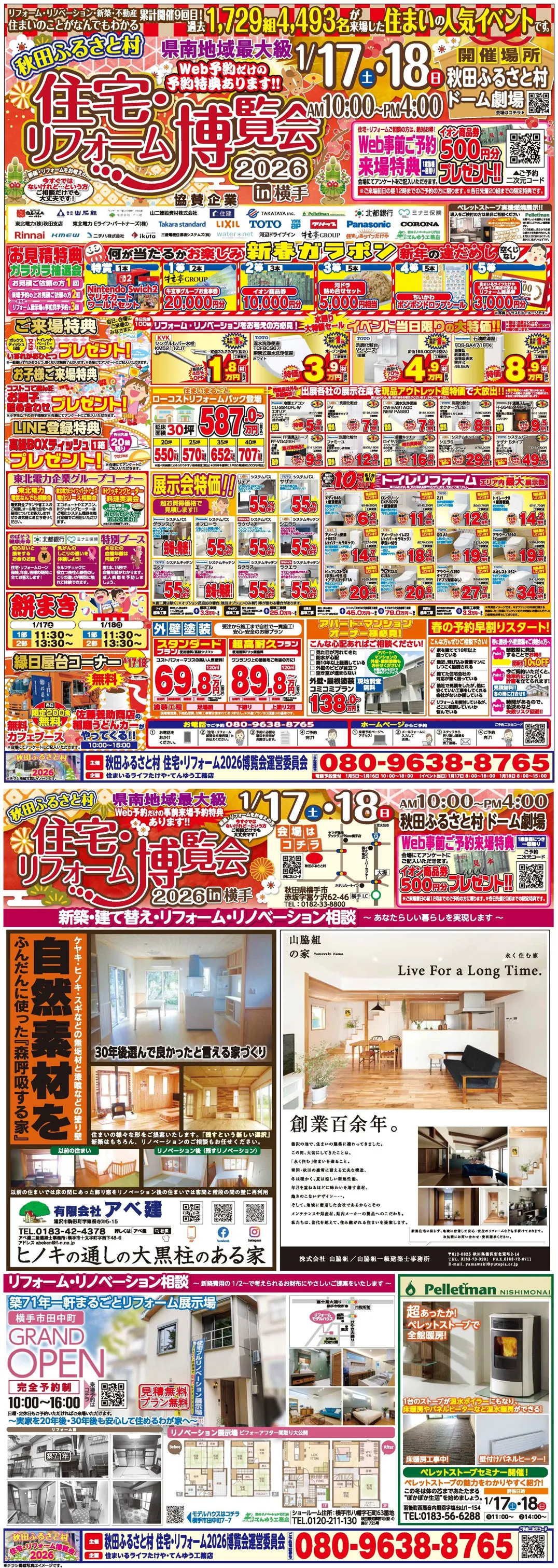 秋田ふるさと村リフォーム博覧会2026のチラシをご確認いただけます! ここには掲載していない特典や商品も多数ご案内しています。ぜひご確認ください!